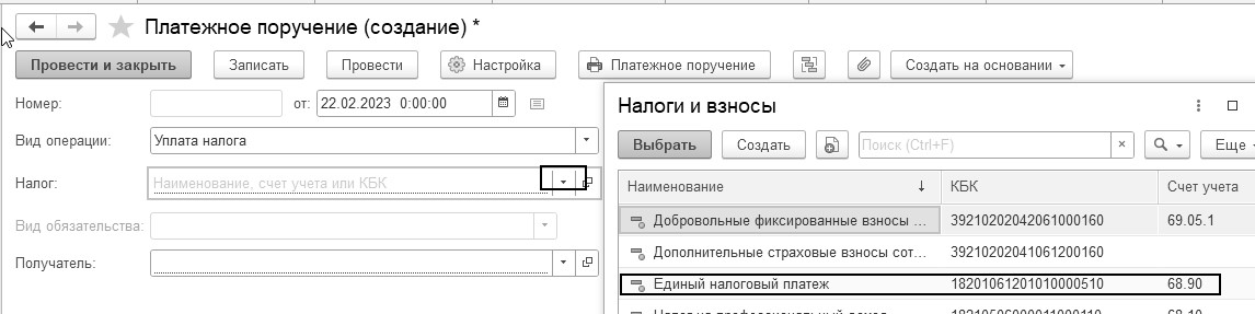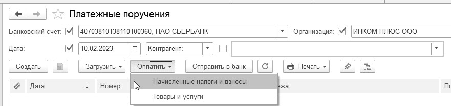 (меню "Панель разделов/Банк и касса/Панель навигации/Банк/Платежные поручения/Оплатить/Начисленные налоги и взносы/Уплата налогов")