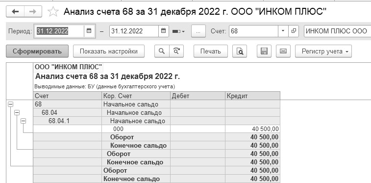 Рис. 7.2.5. Фрагмент формы отчета "Анализ счета 68 за 31.12.2022 года", полученного из формы "Помощник перехода на ЕНС"