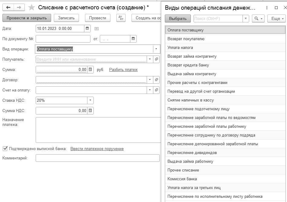 При создании документа "Списание с расчетного счета" программа запросит выбрать вид операции (рис. 7.3.2.1).