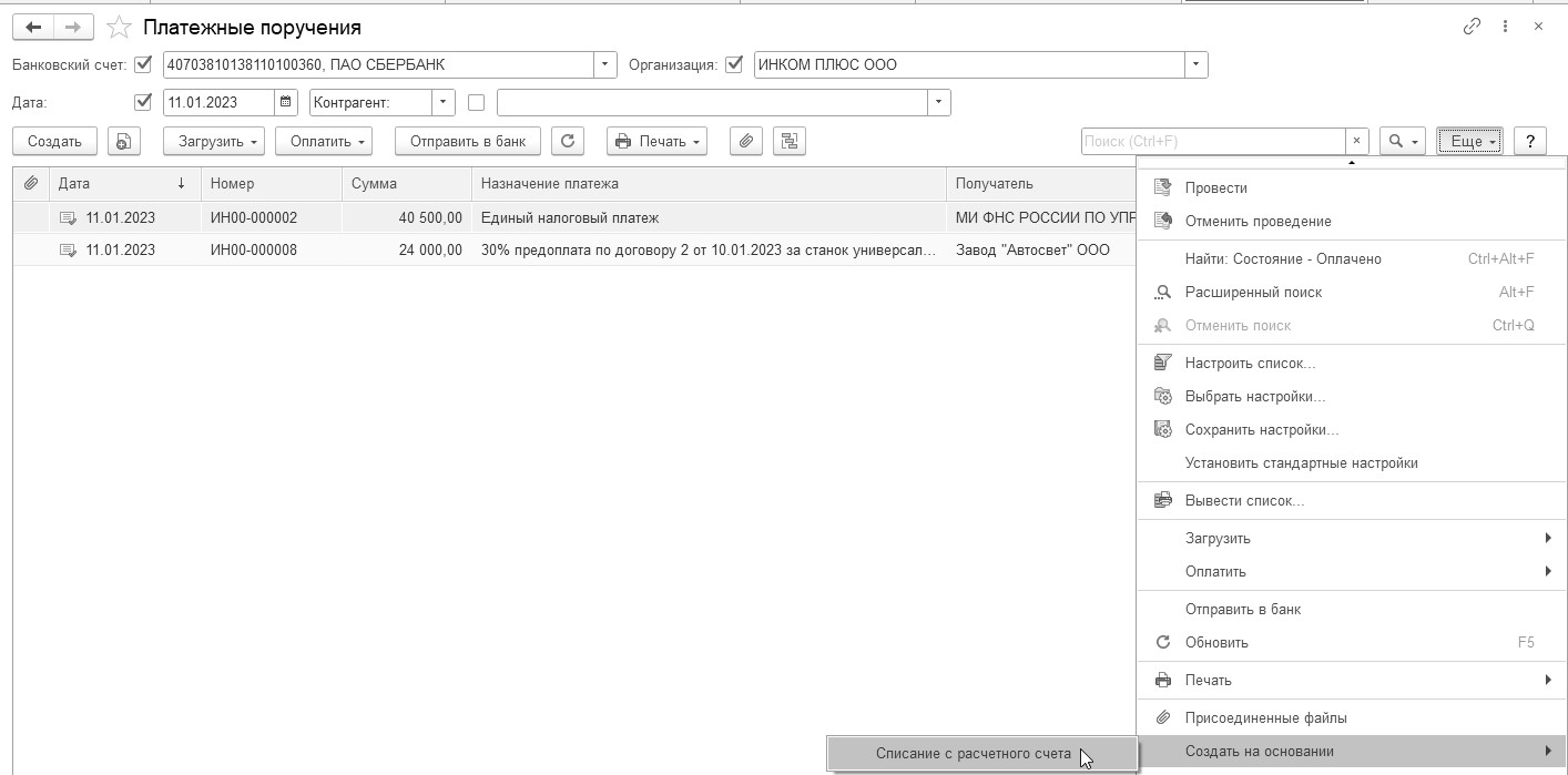 Зарегистрировать оплату платежного поручения нужно после получения выписки из банка при помощи пиктограммы "– Списание" (из формы выписки) или методом "Создать на основании" (из журнала платежных поручений/Еще), как это показано на рисунке 7.3.2.2.