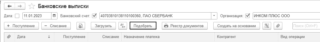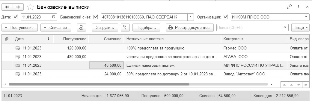Рис. 7.3.2.4. Журнал "Банковские выписки" на 11.01.2023 года