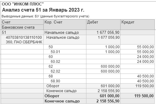 Для анализа движения по расчетному счету сформируйте отчеты "Анализ счета 51", "Карточка 51 счета" за январь 2023 года (рис. 7.3.2.5).