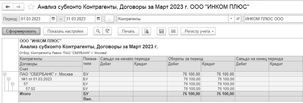 Сформируйте отчет "Оборотно-сальдовая ведомость по счету" 57 и отчет "Анализ субконто" за март 2023 года.