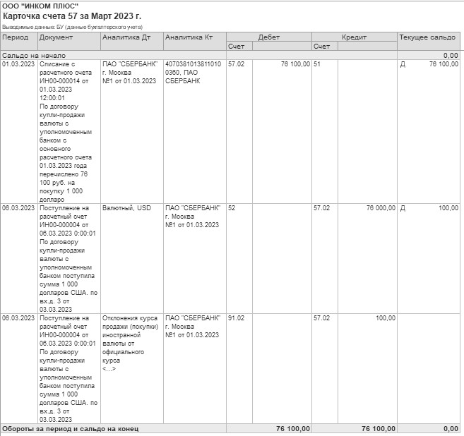 На валютный счет 06.03.2023 года зачисляется приобретенная валюта (1 000 долл.). Курс ЦБР на 06.03.2023 года составляет 76,00 руб. за 1 USD[1].