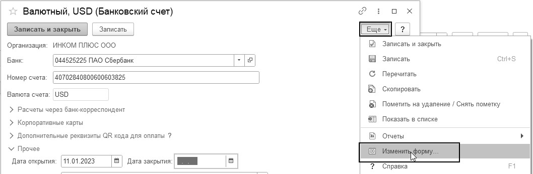 Остановитесь на строке "ИНКОМ ПЛЮС", откройте форму справочника. По гиперссылке "Банковские счета" откройте справочник "Банковские счета". Используя кнопку "Создать" дополните справочник новым счетом "Валютный счет, USD". Заполните диалоговую форму справочника, указав: номер счета – 40702840800600603825, БИК – 044525225, корр. счет 30101810400000000225. Банк – "ПАО СБЕРБАНК". Валюта счета – USD. Сохраните данные. И хотелось бы наименование счета указать не цифрами, а произвольным образом (например, валютный счет, USD). Заполните указанную информацию, ориентируясь на рисунок 7.4.2. Запишите и закройте элемент.
