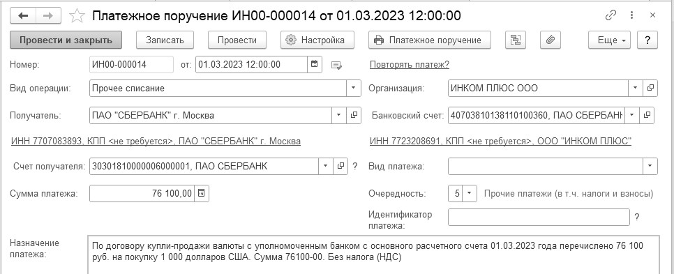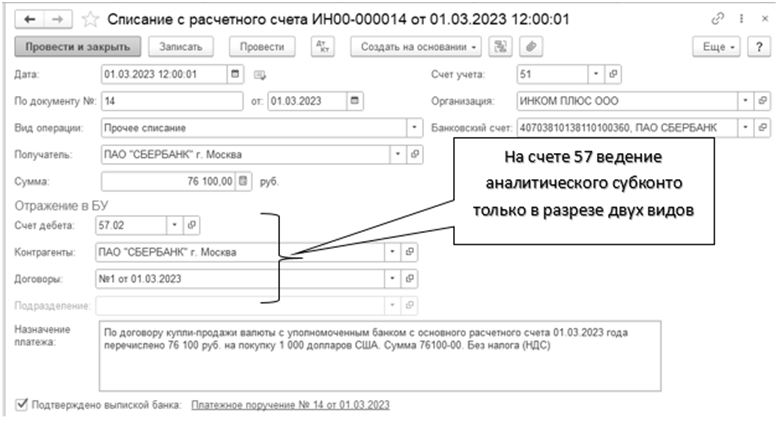 По договору купли-продажи валюты с уполномоченным банком с основного расчетного счета 01.03.2023 года перечислено 76 100 руб. на покупку 1 000 долларов США. Валюта покупается на нужды организации (оплату товара).
