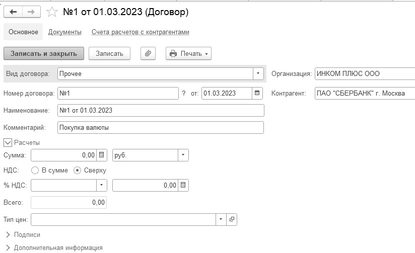 Для контрагента "СБЕРБАНК" (ПАО)" создайте договор "Покупка валюты" под номером 1 от 01.03.2023 года. Форма договора представлена на рисунке 7.4.5.