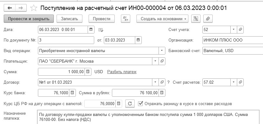06.03.2023 года создайте документ "Поступление на расчетный счет". Входящий номер документа № 3 от 03.03.2023 года. Договор № 1 от 01.03.2023 года "Покупка валюты".