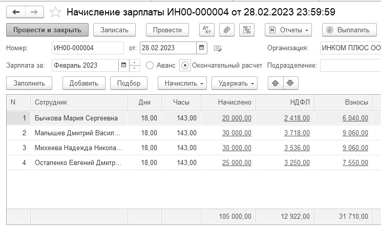 Рассчитайте зарплату (окончательный расчет за февраль), начислите НДФЛ и страховые взносы за февраль 2023 года сотрудникам фирмы "ИНКОМ ПЛЮС", исходя из должностных окладов. Начислить зарплату по всем подразделениям одним документом. Все сотрудники отработали вторую половину месяца полностью.