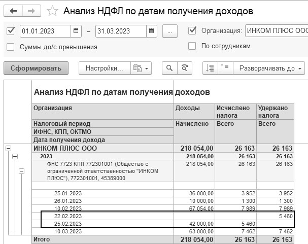 Сформируйте отчет "Анализ НДФЛ по датам получения доходов" за I квартал 2023 года (рис. 8.6.8).