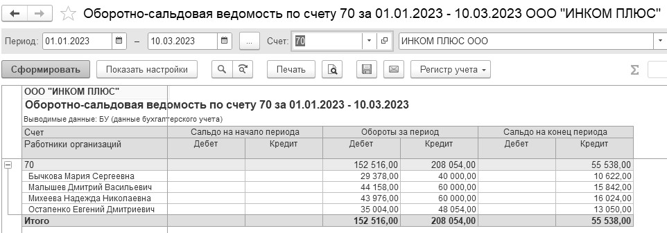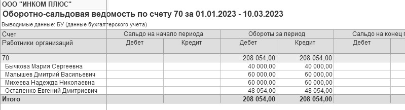 На конец периода зависнет задолженность работодателя перед сотрудниками по заработной плате. В отчете "Оборотно-сальдовая ведомость по счету" 70 остаток на 10.03.2023 года показывает не выплаченную заработную плату (рис. 8.6.2).