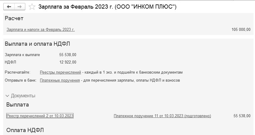 Рассмотрим окончательный расчет по зарплате за февраль, удержание НДФЛ и страховых взносов.