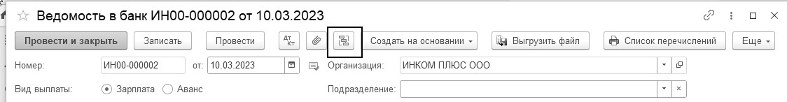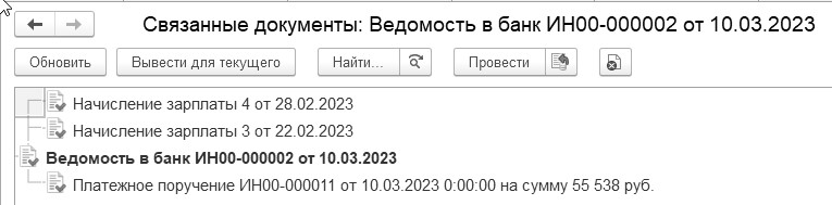 В группе "Выплата" кликните по ссылке "Реестр перечислений 2 от 10.03.2023" – откроется заполненный документ "Ведомость в банк" на сумму 55 538 руб. Посмотрите, какие еще документы созданы программой (рис. 8.6,4).