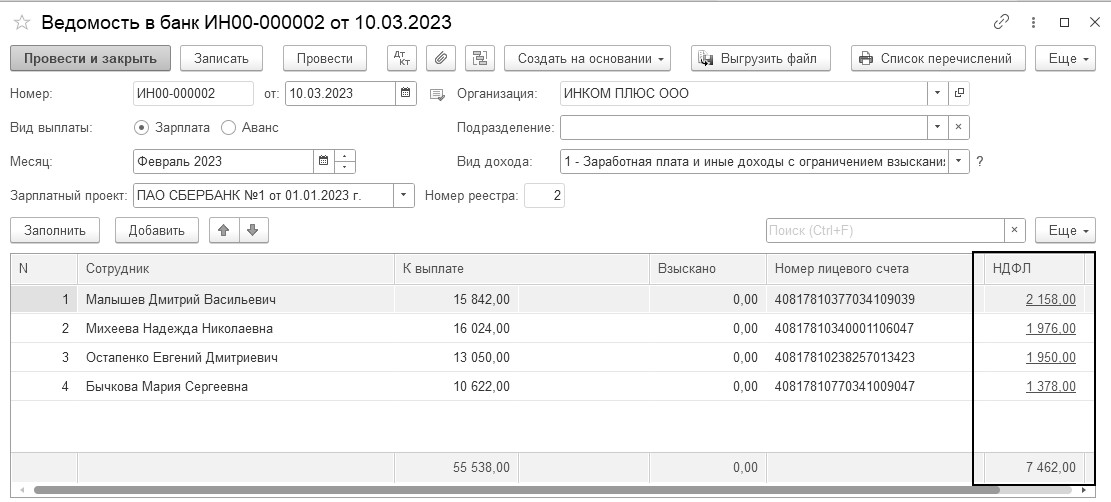Документ "Начисление зарплаты" показывает итоговую сумму НДФЛ 12 922 руб., но при окончательной выплате зарплаты программа видит ранее удержанный НДФЛ (на дату 22.02.2023 года). НДФЛ по ведомости при окончательном расчете составляет 7 462 руб. Эта сумма получилась так: (12 922 – 5 460 (сумма НДФЛ из ведомости от 22.02.2023)).