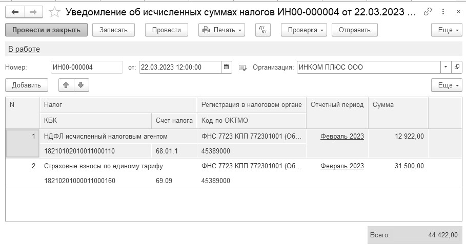 22.03.2023 года подготовить уведомление: по НДФЛ в сумме 12 922 руб. и страховые взносы по единому тарифу 31 500 руб. (рис. 8.6.6).