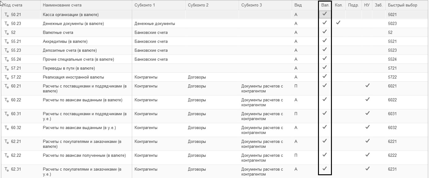 В плане счетов прописан валютный учет. Если в графе "Вал" стоит знак
