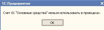 Если счет является группой, то такой счет не может использоваться при вводе проводок – проводки могут быть созданы только по субсчетам этого счета. Например, счет 01 "Основные средства", является счетом-группой, и выбрать его в операцию программа не позволит. Будет выдано следующее сообщение (рис. 1.3.4).
