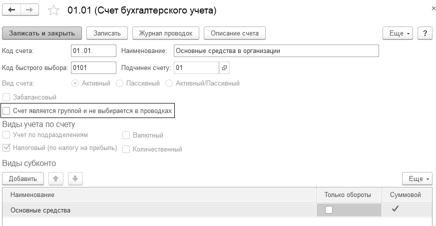 Рис. 1.3.6. Форма диалога счета 01.01 плана счетов