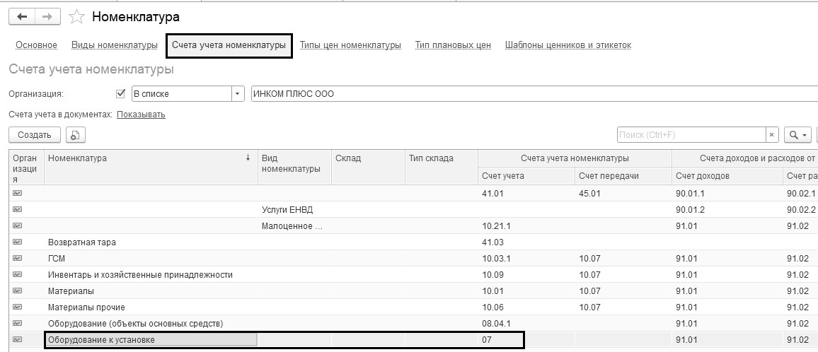 для номенклатурной группы "Оборудование к установке"