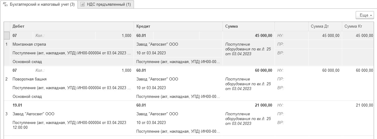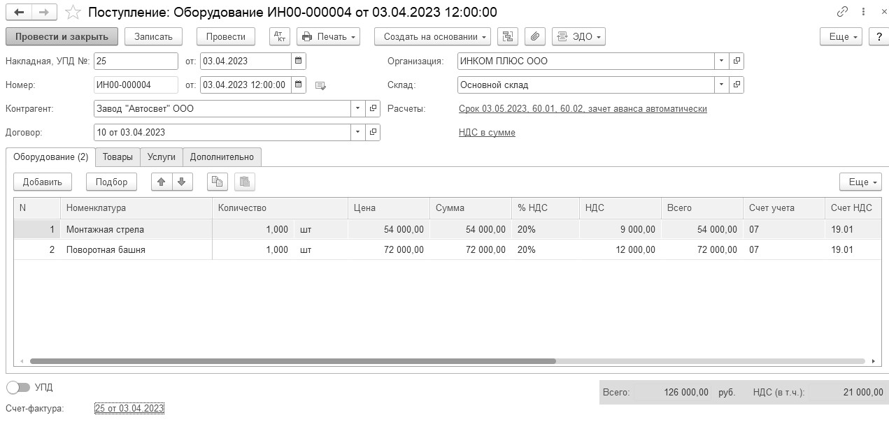03.04.2023 года заводом "АВТОСВЕТ" представлена накладная № 25 и счет-фактура № 25 за башенный кран по договору № 10 от 03.04.2023 года на сумму 126 000 руб., в т. ч. НДС 20%.