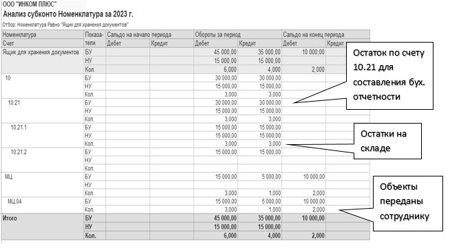 При поступлении малоценного оборудования и запасов, учтенных на счете 10.21.1, в бухгалтерском учете их стоимость сразу же списывается на расходы, но в корреспонденции с регулирующим счетом 10.21.2. Таким образом, на основном счете 10.21.1 мы видим бухгалтерскую, налоговую стоимость и количество объектов на складе, а на счете 10.21.2 -обобщенную информацию по этим объектам, которая используется при составлении бухгалтерской отчетности.