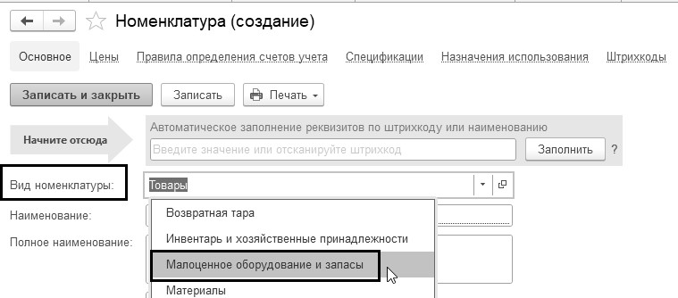 В программе в справочнике "Номенклатура" организован вид номенклатуры "Малоценное оборудование и запасы". Если в документе поступления или в авансовом отчете указать номенклатурную позицию с видом "Малоценное оборудование и запасы", то вместо счета учета для такого объекта будет выбираться счет и аналитика затрат, которые будут использованы для отражения расходов в бухгалтерском учете.