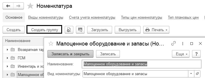 Рис. 9.5.2. Создание группы и элемента номенклатуры