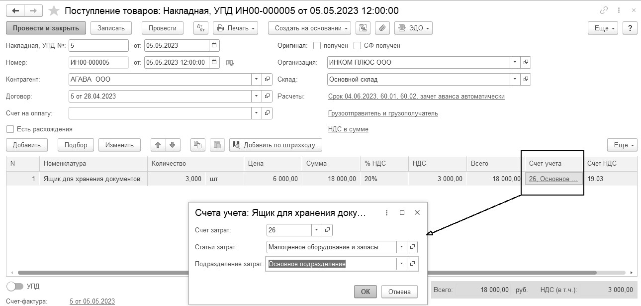 05.05.2023 года ООО "АГАВА" представлена накладная № 5 и счет-фактура № 5 на три ящика для хранения документов по договору № 5 от 28.04.2023 года на сумму 18 000 руб., в т. ч. НДС 20%.