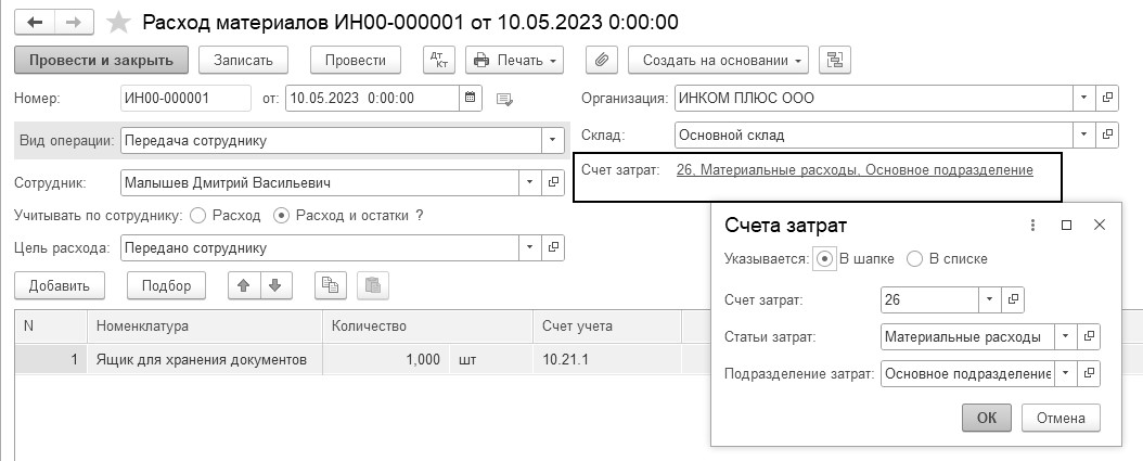 10.05.2023 года создайте документы "Расход материалов", вид операции "Передача сотруднику". Передайте ящики Малышеву Д.В., Михеевой Н.Н., Бычковой М.С. в основное подразделение. Ящики следует списать на счет 26 "Общехозяйственные расходы" (рис. 9.5.4).