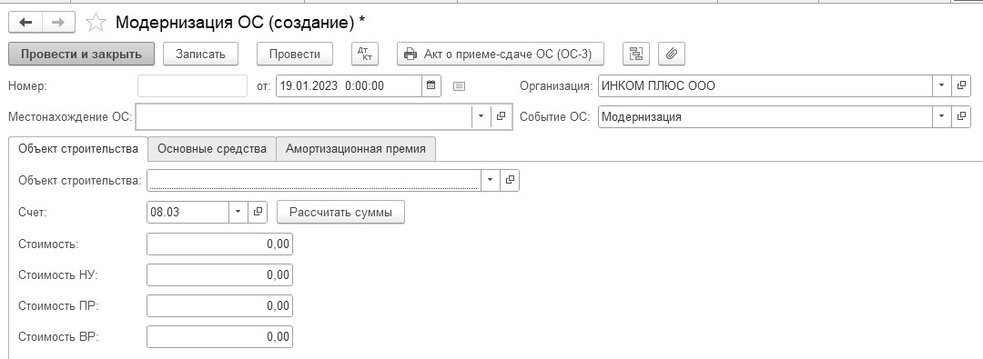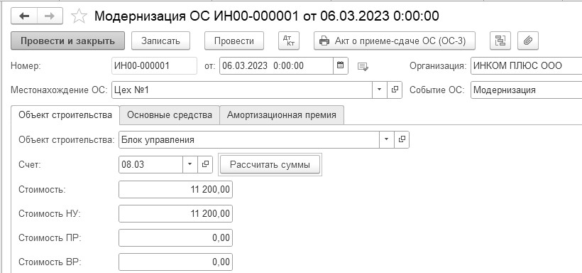 В программе документ "Модернизация ОС" предназначен для отражения модернизации. Обратиться к документу "Модернизация ОС" можно при помощи меню "Панель разделов/ОС и НМА/Панель навигации/Учет основных средств/Модернизация ОС". Этот документ состоит из шапки документа, закладок "Объект строительства", "Основные средства" и "Амортизационная премия". Заполнение документа следует начинать с шапки документа, с последующим переходом на закладку "Объекты строительства", где обязательно следует нажать кнопку "Рассчитать суммы". В результате, суммы модернизации заполнятся автоматически по данным учета на момент формирования документа. При необходимости эти суммы можно откорректировать вручную.