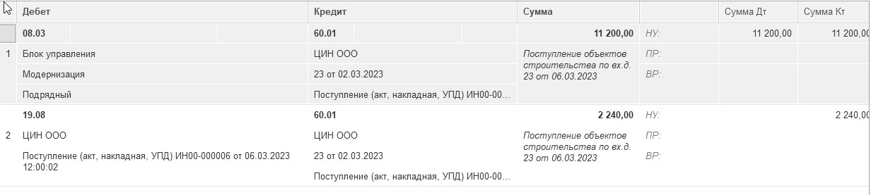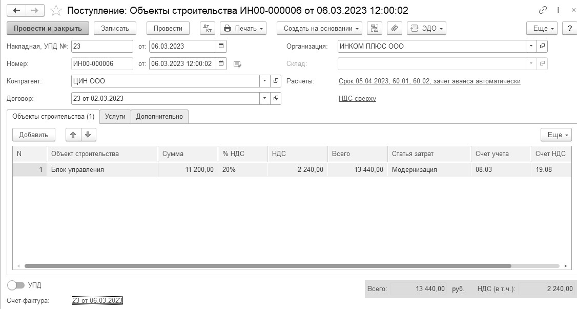 06.03.2023 года ООО "ЦИН" представил накладную № 23 и счет-фактуру № 23 за блок управления. Цена блока управления 11 200 руб. (НДС 20% сверху). Заключен договор № 23 от 02.03.2023 года. Сумма накладной 13 440 руб., в т. ч. НДС.