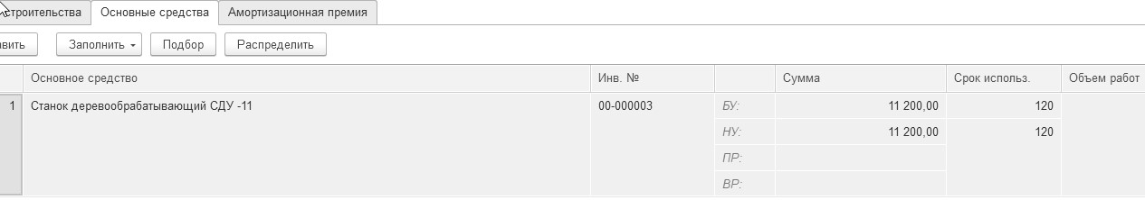 Для автоматического заполнения табличной части документа нажмите кнопку "Распределить", которая расположена вверху, над табличной частью документа. Но сначала, выберите в табличную часть основное средство "Станок деревообрабатывающий".