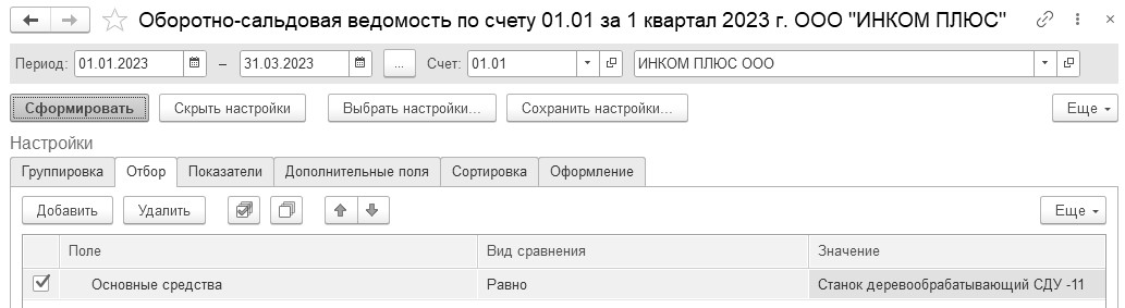 Воспользуйтесь панелью настройки, на закладке "Отбор" укажите основное средство "Станок деревообрабатывающий" (рис. 9.6.5).