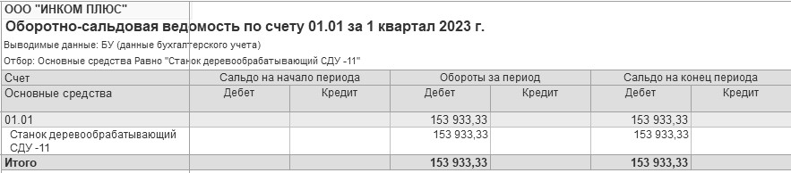 Сформируйте оборотно-сальдовую ведомость по счету 01.01 "Станок деревообрабатывающий" за I квартал 2023 года и убедитесь, что первоначальная стоимость станка увеличилась с 142 733,33 руб. до 153 933,33 руб.