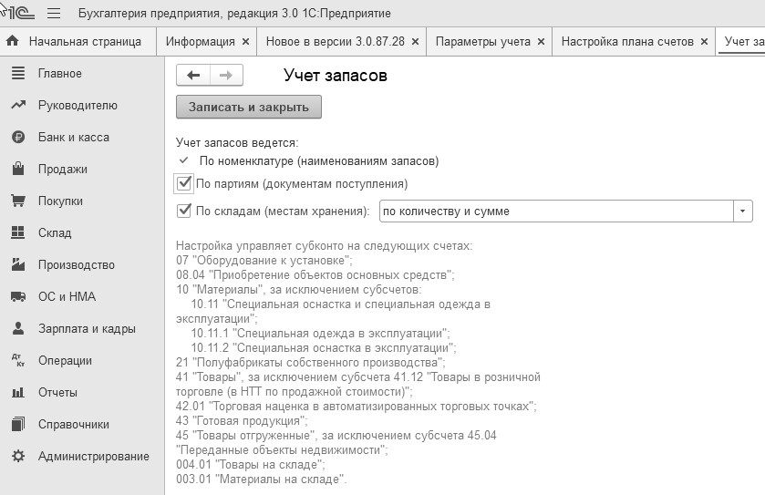 При установленных флагах "По партиям (документам поступления)" и "По складам (местам хранения)" добавляются дополнительные субконто "Партии" и "Склады" на соответствующие счета учета ТМЦ.