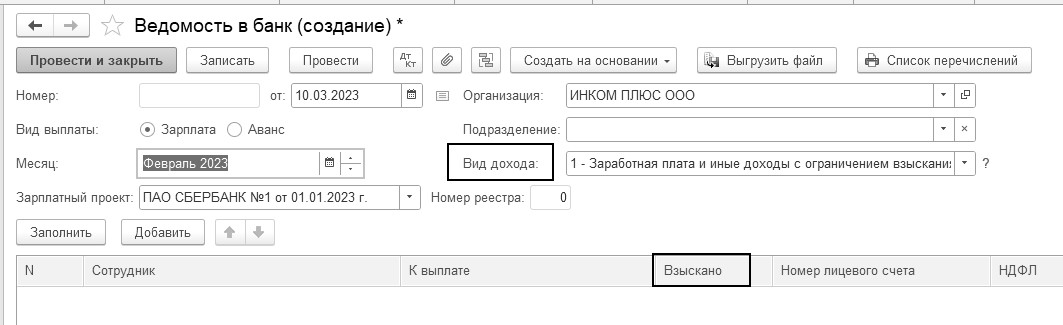 В документе "Ведомость в банк" есть поле "Вид дохода" (рис. 1.4.12). Если выбрать значение в этом поле, то при заполнении ведомости в нее попадут начисления, зарегистрированные с указанным видом дохода. Также добавлена новая колонка в табличную часть документов "Взыскано". В ней отражаются автоматически суммы, удержанные по исполнительным листам. Доходы с разными кодами попадают в разные ведомости.