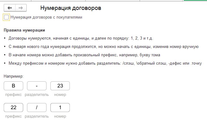 Можно настроить автоматическую нумерации договоров с покупателями. В этом случае, договорам присваивается очередной порядковый номер в календарном году. Календарный год определяется по дате договора (рис. 1.4.15).