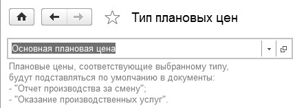 Если есть производство или производственные услуги, то еще появляется гиперссылка "Тип плановых цен", которая предназначена для того, чтобы в документы "Отчет производства за смену" и "Оказание производственных услуг" по умолчанию подставлялись плановые цены на продукцию или услуги. По умолчанию разработчиками программы, в данной форме, будет установлен тип цены "Основная плановая цена" (рис. 1.4.17).
