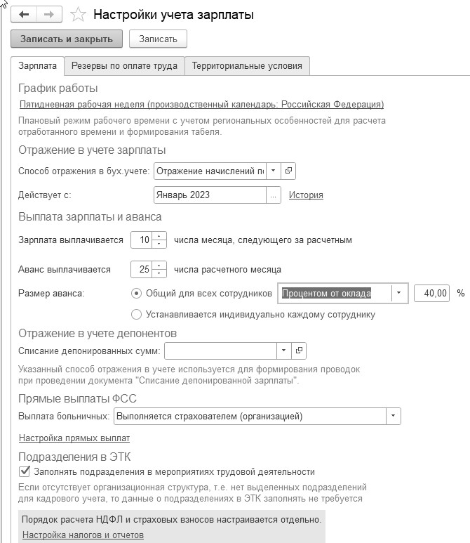 Кликнув по автоматически заполненной программой строке, пользователь попадает в форму "Настройки учета зарплаты", которая может состоять из двух закладок: "Зарплата" и "Территориальные условия", или из трех закладок: Зарплата", "Резервы отпусков" и "Территориальные условия". Количество закладок зависит от флага "Расчет резервов по оплате труда", который может быть установлен в сворачиваемой группе "Расчет зарплаты". В этой форме можно указать: