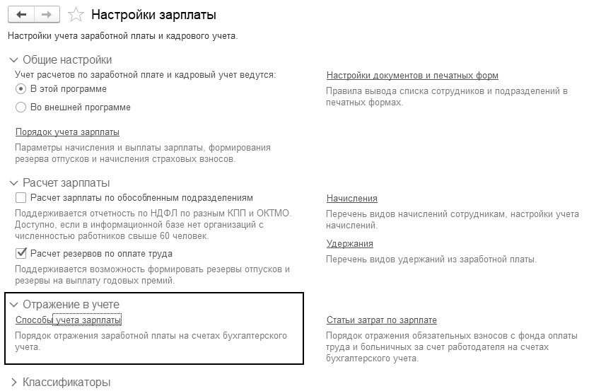 (меню "Панель разделов/Зарплата и кадры/Панель навигации/Справочники и настройки/Настройки зарплаты/Отражение в учете/Способы учета зарплаты")