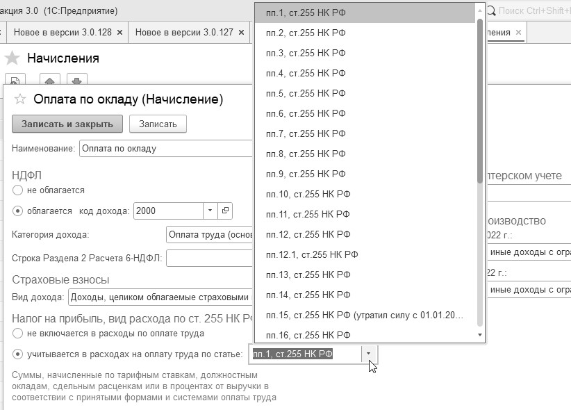 Поэтому, когда создаются элементы видов "Начислений" надо определиться с подпунктом статьи 255 НК РФ и создать столько таких способов, сколько подпунктов нужно бухгалтеру организации отразить для корректного расчета зарплаты (рис. 1.4.7).