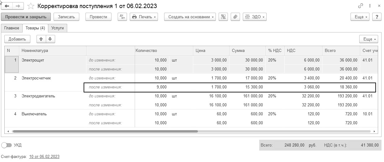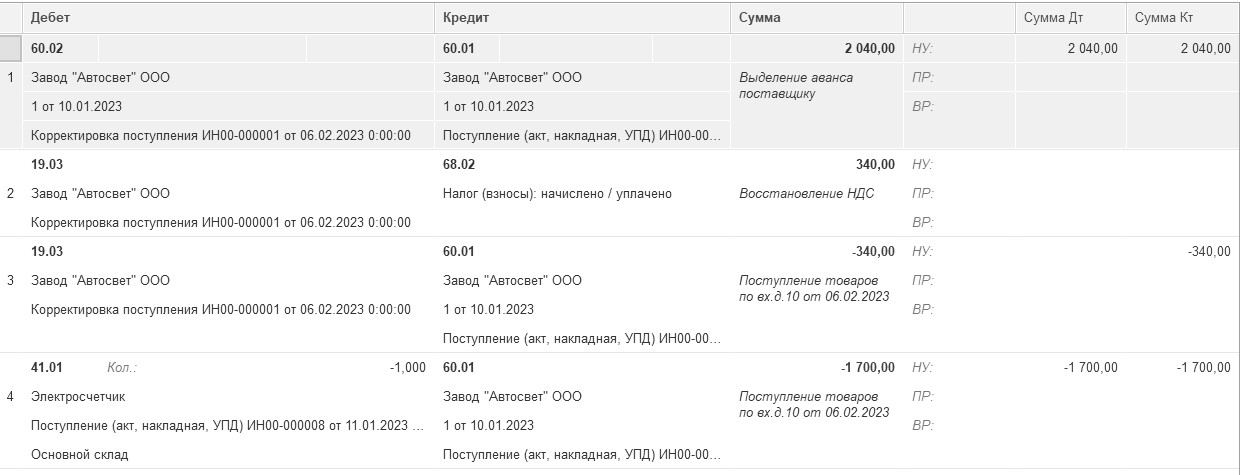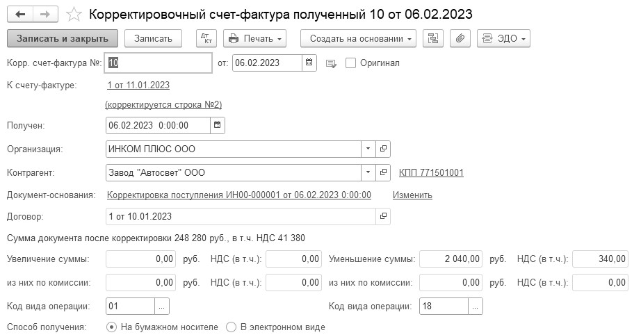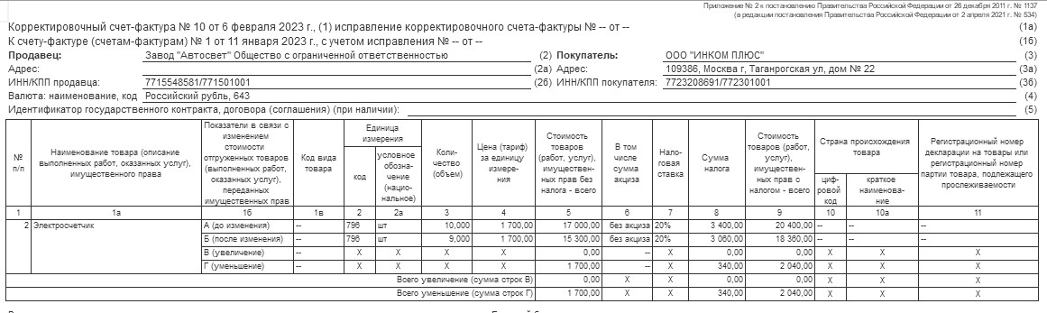 06.02.2023 года ООО "ИНКОМ ПЛЮС" получило корректировочный счет-фактуру № 10 от завода "АВТОСВЕТ" на сумму 41 380 рублей.