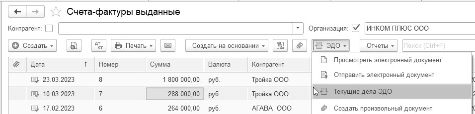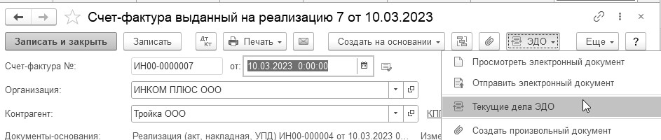Мы уже изучили, как создать документ реализации, выписать счет-фактуру. При бумажном документообороте мы бы распечатали эти документы и передали клиенту каким-либо образом. Сейчас на одном примере мы рассмотрим, как можно подписать и отправить документы в электронном виде.