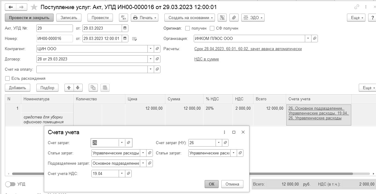 29.03.2023 года были приобретены средства для уборки офисного помещения. От ООО "ЦИН" поступили накладная, счет-фактура № 29 на сумму 12 000 рублей, в т. ч. НДС 20%, договор№ 28 от 29.03.2023 года.