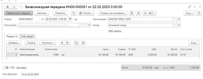 22.02.2023 года создайте документ "Безвозмездная передача".