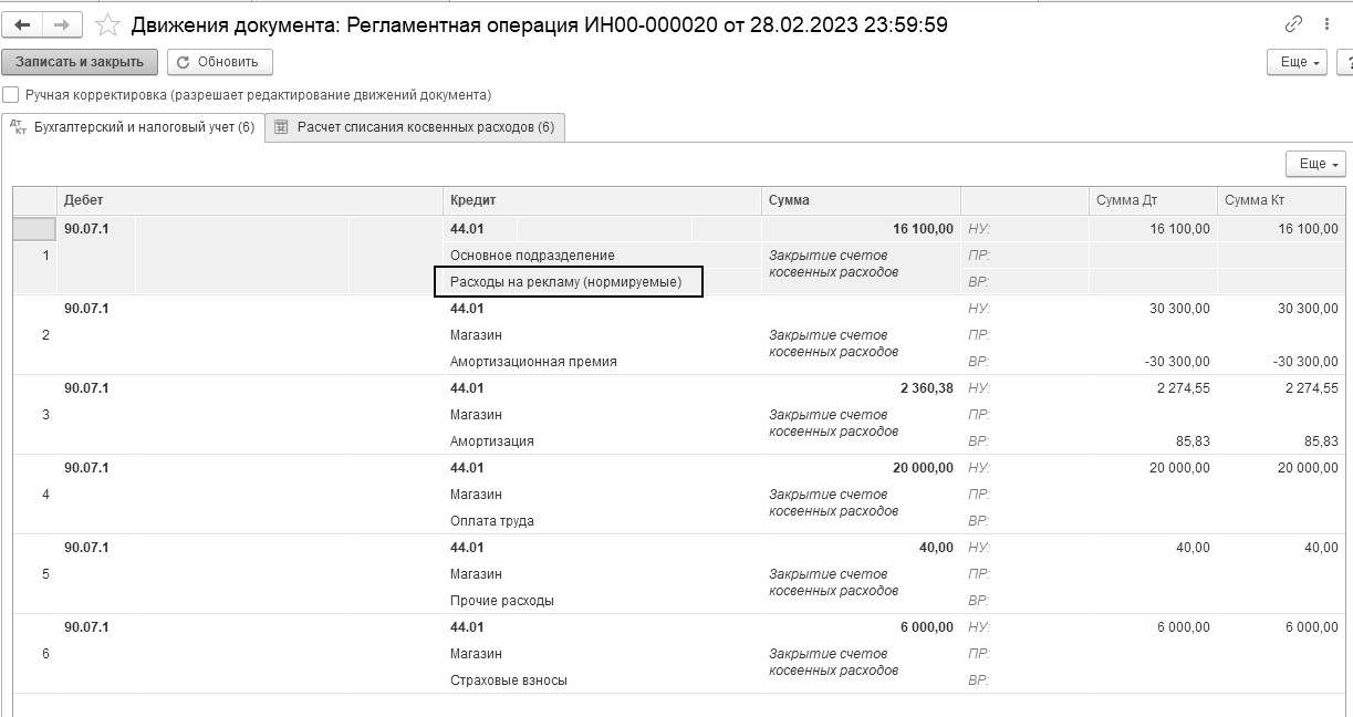 В форме помощника "Закрытие месяца" нажмите кнопку "Выполнить закрытие месяца". Документ сформирует бухгалтерские и налоговые записи по списанию торговых затрат в Д 90.07.1 К 44.01 (расходы на рекламу (нормируемые)). Движение документа "Регламентная операция" по операции "Закрытие счета 44 "Издержки обращения"" представлены на рисунке 18.5.