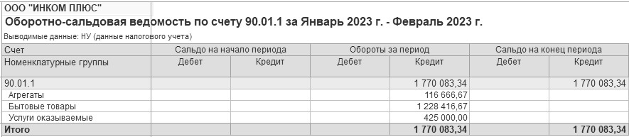 Как посчитана выручка за январь – февраль? Сформируйте оборотно-сальдовую ведомость по счету 90.01.1, но в панели настроек снимите флаг "БУ (данные бухгалтерского учета)" и установите флаг "НУ (данные налогового учета)". Уберите детализацию по номенклатурным группам. Отчет показан на рисунке 18.7.