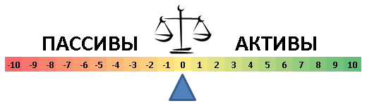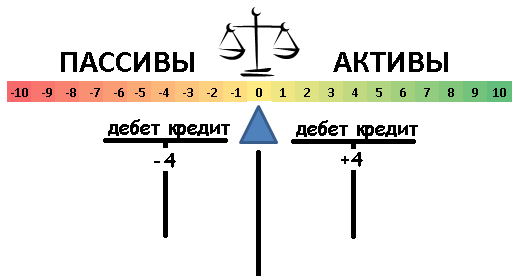 Для соблюдения баланса, любую бухгалтерскую запись можно рассматривать как одновременное увеличение актива и уменьшение пассива. То есть, если пассивные и активные счета записать на приведенной оси слева и справа соответственно, то получается, что для соблюдения баланса активов и пассивов, два счета должны одновременно как бы приближаться к «нулю» или наоборот, удаляться от «нуля». С учетом того, что счет АКТИВА положительный, то для его увеличения к нему надо прибавить какое-то число, в тоже время счет ПАССИВА отрицательный, и для его увеличения от него надо вычесть какое-то число.
