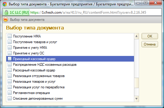 – в форме Выбор типа документа выбрать строку Приходный кассовый ордер и щелкнуть мышью по кнопке <ОК>.