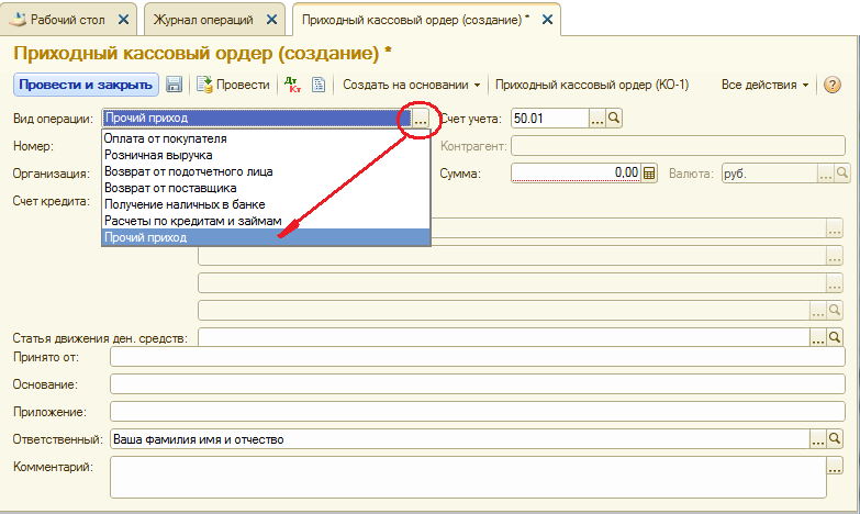 на панели инструментов, либо по команде Создать контекстного меню, либо нажатием на клавишу клавиатуры <Insert>) открыть форму Приходный кассовый ордер (создание).